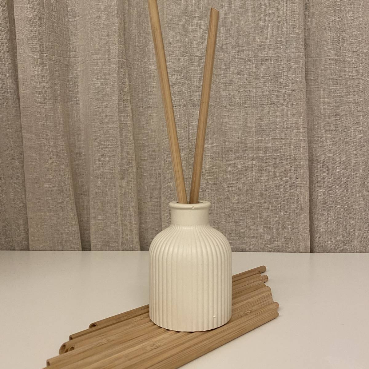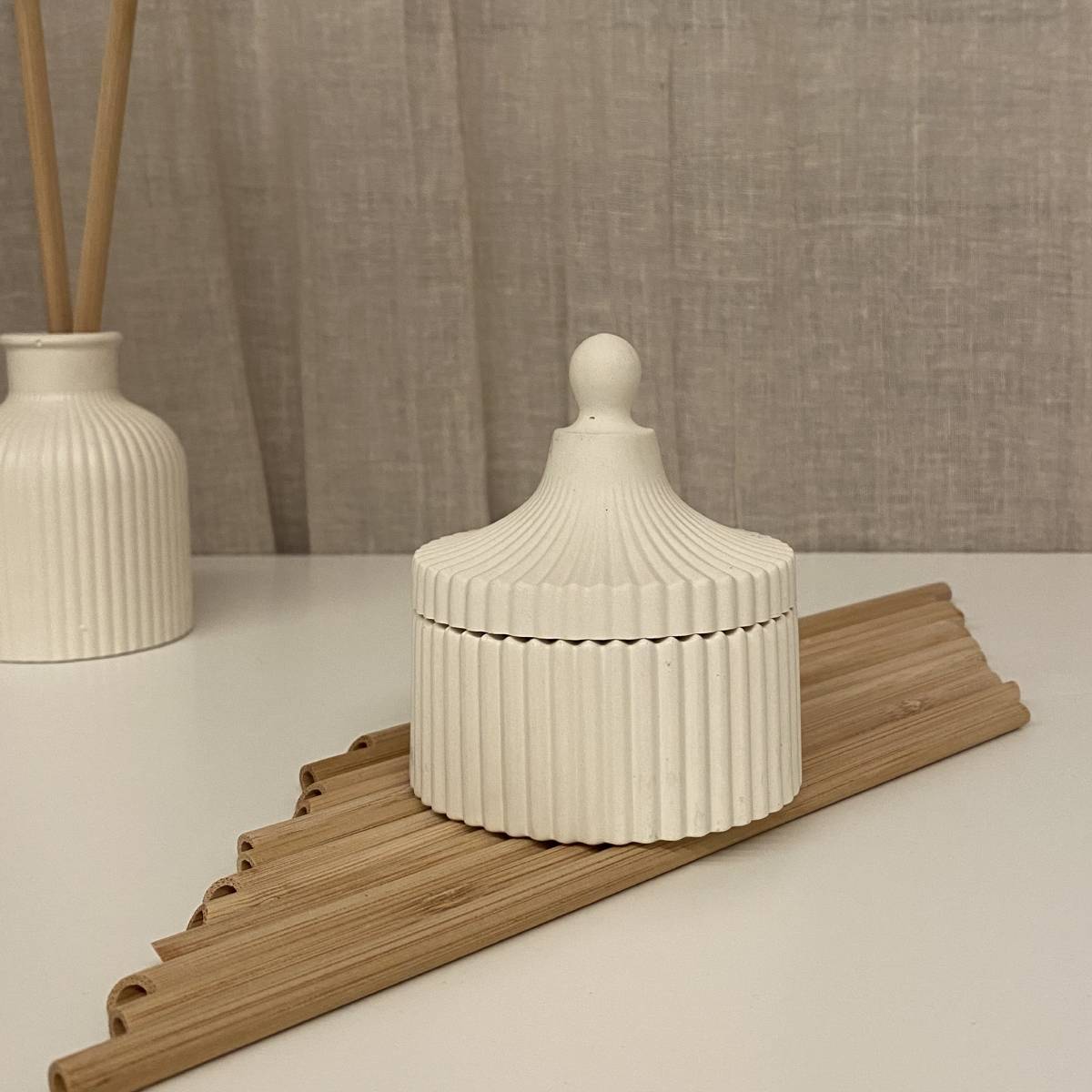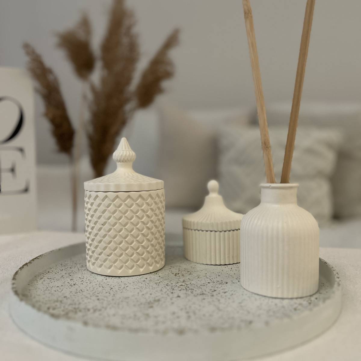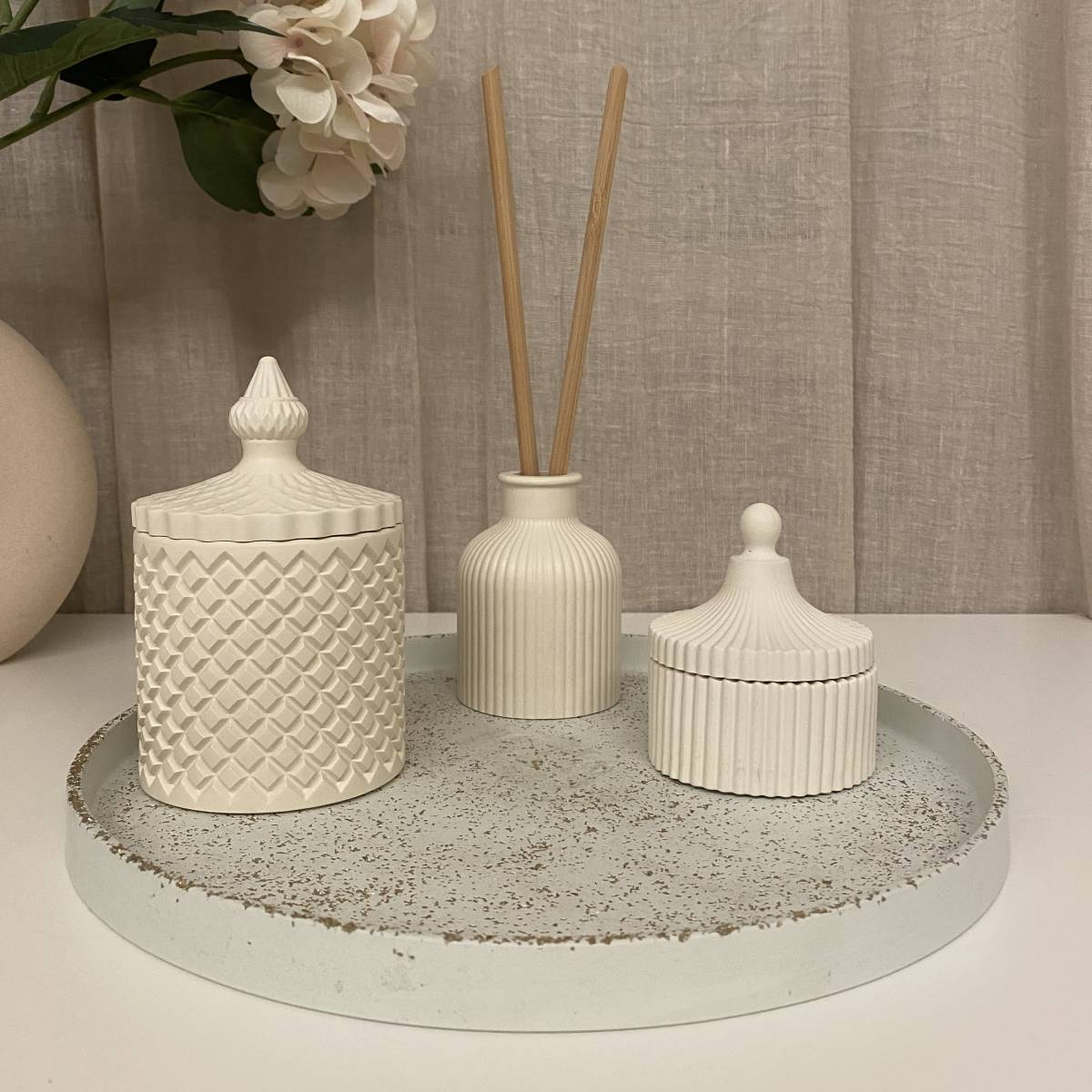 Ο δίσκος λειτουργεί ως βάση για τα στοιχεία μεταξύ τους και αναδεικνύει τα υπόλοιπα βάζα beige linen χρώμα σαν ενιαίο σύνολο. Οι απλές γραμμές και οι ουδέτεροι τόνοι προσφέρουν διακριτική κομψότητα και φυσική αρμονία, ιδανική για σύγχρονους και ήρεμους χώρους.