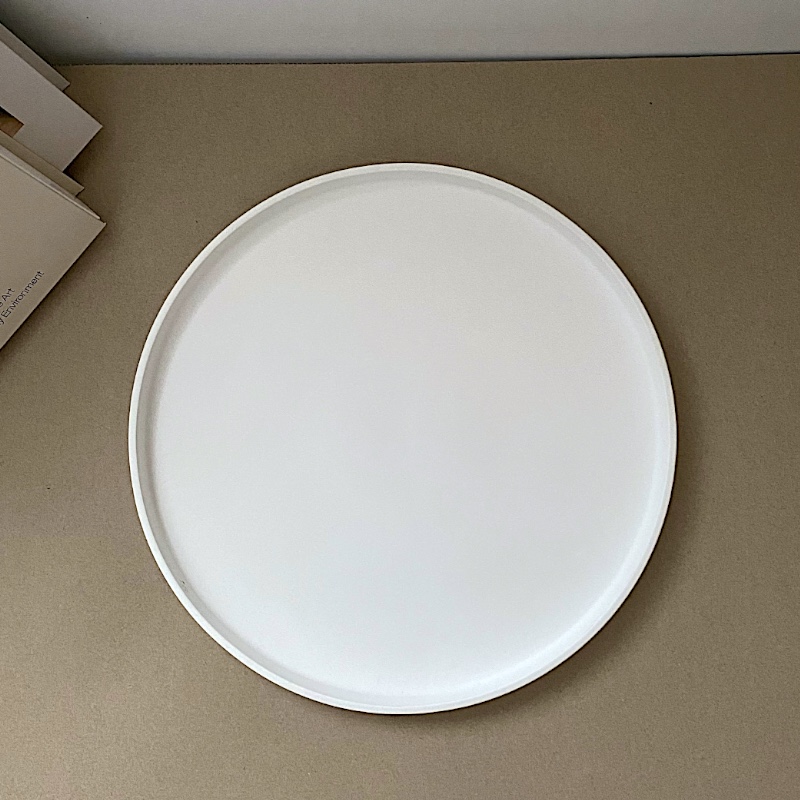 Διακοσμητικός δίσκος χειροποίητος σε λευκό χρώμα κυκλικός με γείσο σχεδιασμένος με έμφαση στην απλότητα και την ισορροπία.