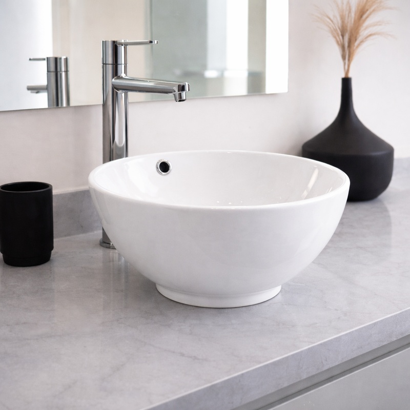 Νιπτήρας μπάνιου επικαθήμενος F319 της Ceramita, κατασκευασμένος από πορσελάνη υψηλής ποιότητας σε λευκό χρώμα. Ο στρογγυλός σχεδιασμός του προσφέρει μοντέρνα αισθητική και ταιριάζει ιδανικά σε σύγχρονους αλλά και minimal χώρους μπάνιου, προσδίδοντας κομψότητα και καθαρότητα στον χώρο.