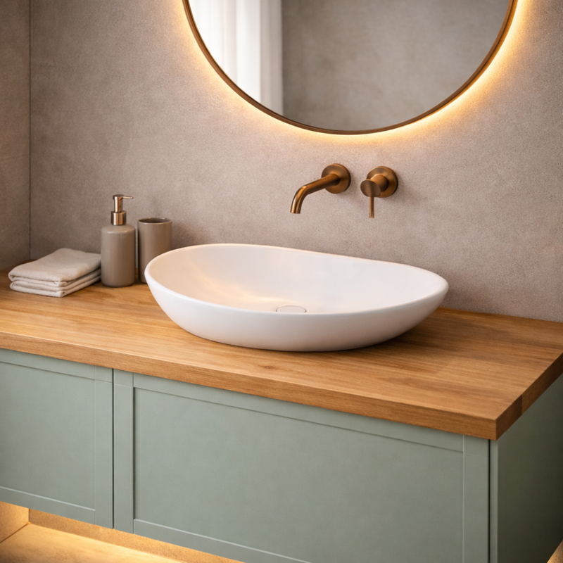 Ο σχεδιασμός του είναι κομψός και διαχρονικός, με καθαρές γραμμές που ταιριάζουν απόλυτα σε minimal, modern και contemporary μπάνια. Τοποθετείται ως επικαθήμενος πάνω σε πάγκο μπάνιου, είτε ξύλινο, είτε μαρμάρινο, είτε από τεχνογρανίτη, προσφέροντας ευελιξία στον σχεδιασμό του χώρου.
